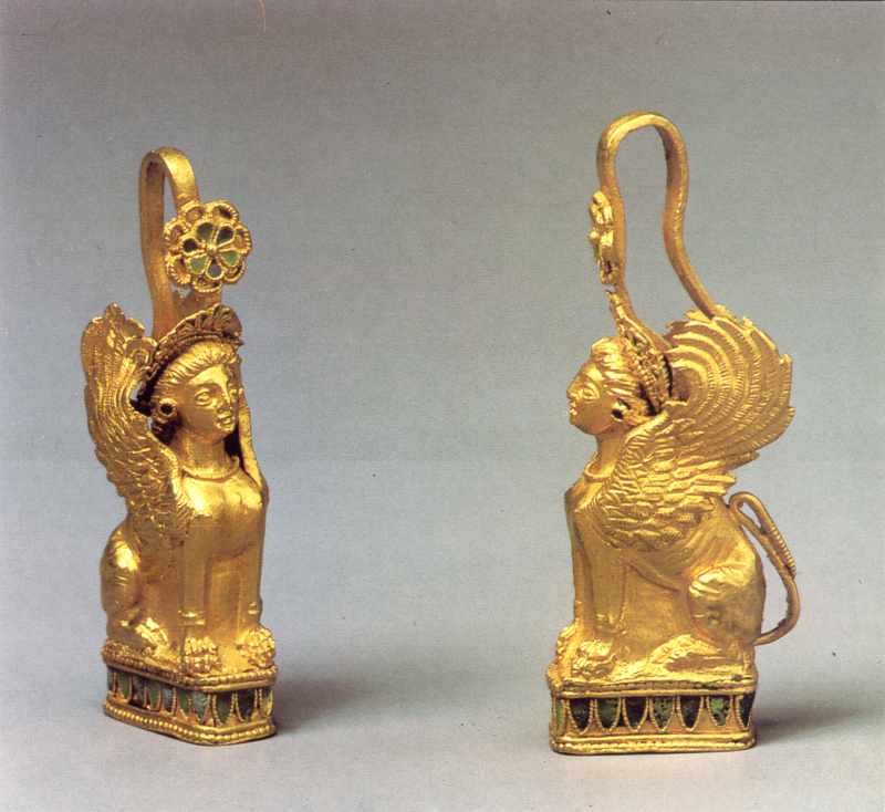 Скроневі кулони у формі сидячих сфінксів. Деталі покриті синьою та зеленою емаллю.