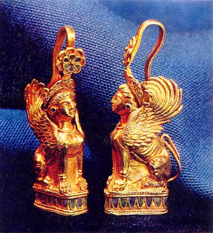 Скроневі кулони у формі сидячих сфінксів Розмір зображення: 732:800 піксел Вкладені елементи Загальний вигляд (+) Загальний вигляд (+) Загальний вигляд