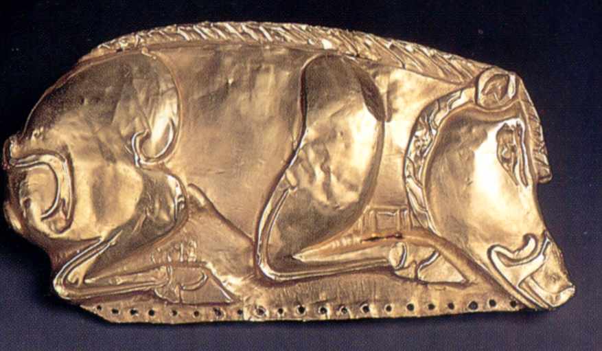Накладка у формі кабанаРозмір зображення: 877:511 піксел Джерело: Gold der Steppe: Archaeologie der Ukraine. – Schleswig: 1991, S. 358. |