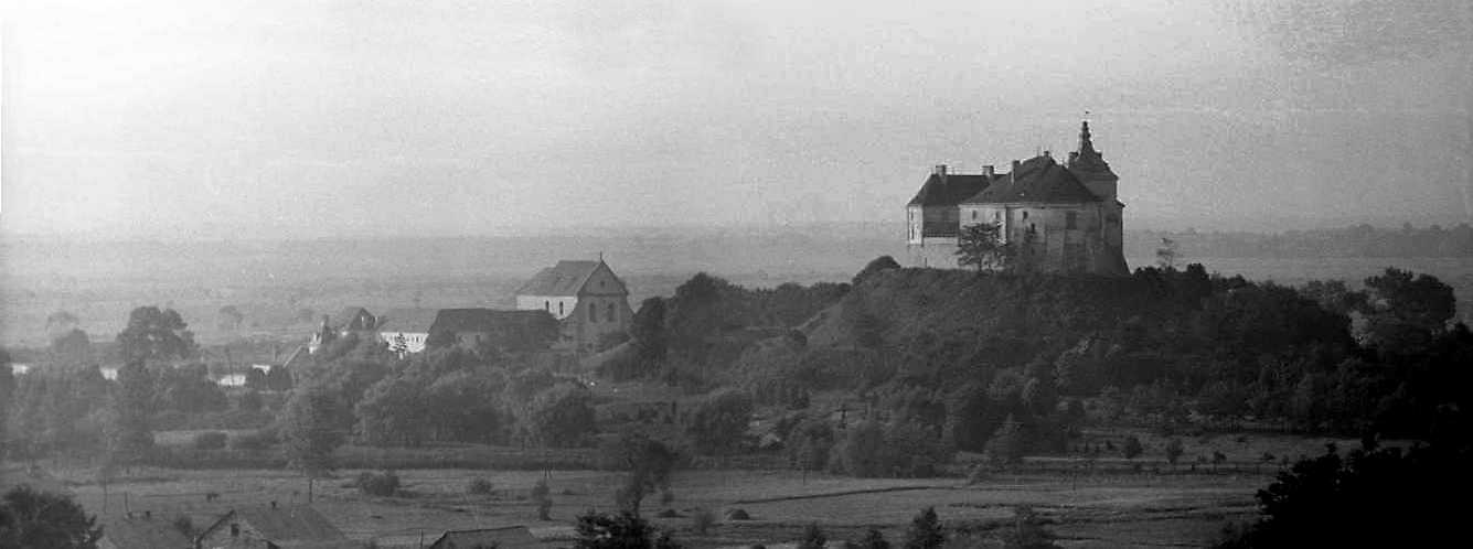 1988 р. Панорама кляштора і замку з півдняРозмір зображення: 1335:498 піксел 1988 р. 15 серпня. Фото М.І.Жарких. Негатека, № 461-05+6. |