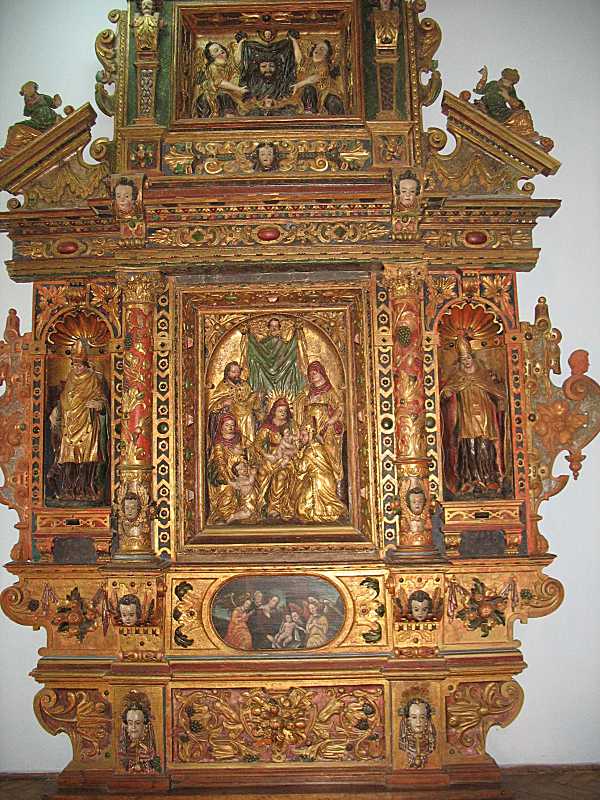 В залі розміщено два вівтарі (найдавніша форма споруди для поклоніння божеству). У вівтарі, підписаному монограмою “МТ” (1608 р.), в єдиному стилістичному ключі об’єднуються архітектурна конструкція, кругла скульптура, високі і низькі рельєфи та живопис. У центральній частині вівтаря – рельєф “Свята родина”, по боках, у нішах, вміщено фігури св. Станіслава і Войцеха, вище – алегоричні постаті, досконало виконані в круглій скульптурі. Розчленований ярусами вівтар, прикрашений голівками ангелів, розетками, колонами, гірляндами фруктів, перевитими виноградною лозою, має ренесансний характер із впливами маньєризму.