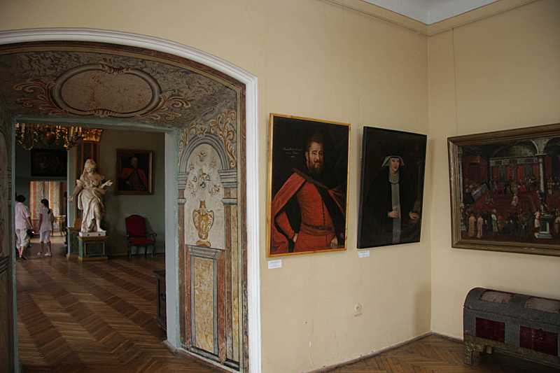 Фрагмент інтер’єру кімнат (5) та (1)Розмір зображення: 800:533 піксел Фото Зенона Боровця і Богдана Тхора, 13 серпня 2009 р. Праворуч – фрагмент картини «Король приймає послів», нижче – фрагмент скрині. |