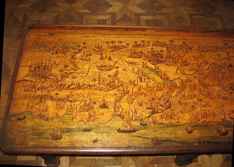 Карта зображає Палестину – Святу землю. На передньому плані – Середземне море. Північ – ліворуч, схід – вгорі, південь – праворуч. В центрі зеленим кольором позначене Мертве море, біля правого краю фото – фрагмент Єрусалиму. Всі замки на карті підписані, мабуть, можна прочитати.