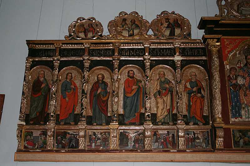 Ліва частина іконостаса Розмір зображення: 800:533 піксел Фото Зенона Боровця і Богдана Тхора, 13 серпня 2009 р. Вкладені елементи Пророки Єзекиїл та Авакум Пророки Ісайя та (4) Пророки Соломон та Яків (?) Апостол Андрій Апостол Фома Апостол Варфоломій Апостол Марк Апостол Матфій Апостол Петро Різдво богородиці Різдво Христове Благовіщення Хрещення Введення Марії до храму Стрітення