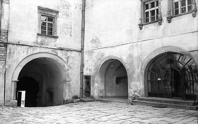 1977 р. Фрагмент надбрамної башти і південного корпусу. Вигляд з північного заходуРозмір зображення: 800:499 піксел 1977 р. 26 липня. Фото М.І.Жарких. Негатека, № A342-35. |