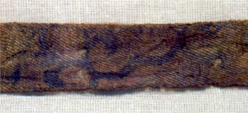 Шовк із нерівномірних за товщиною слабоскручених ниток (S-скрут). Саржа (двошарова), візерунок зроблено за допомогою зміни піткання. Густина: основи 70, піткання – 40 ниток на 1 см