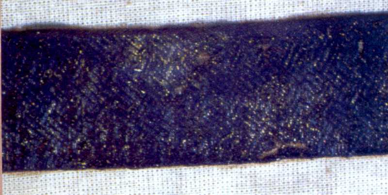 3. Тасьма з „паркетним” візерунком. Нитки основи шовкові, S-скрут. Нитки піткання теж шовкові, скручені слабенько (також S-скрут). Виткана двома основами з тонкої скрученої пряжі й двома пітканнями слабоскруче-ної товстої пряжі. Одна нитка піткання – прядене золото S-скруту. Основа золотної нитки – шовк слабенького Z-скруту.
