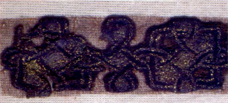 4. Стрічка з візерунком, гаптованим золотними нитками. Нитки піткання й основи – шовкові S-скрути. Саржа складна: дві основи, два піткання. Густина: 50 ниток на 1 см. Прикрашено гаптуванням у техніці „на прокол”. Нитка для гаптування – прядене золото тугого Z-скруту.