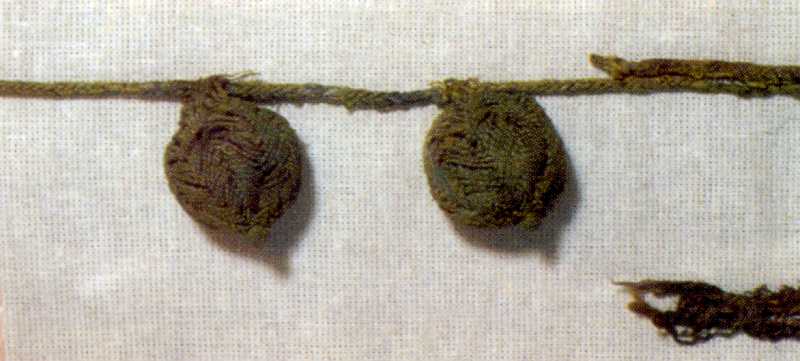8. Плетена тасьма з грушуватими підвісками. Стрічка – тоненька кіска з шовкових ниток зеленавого кольору, із закріпленими на ній жовто-зеленими підвісками.