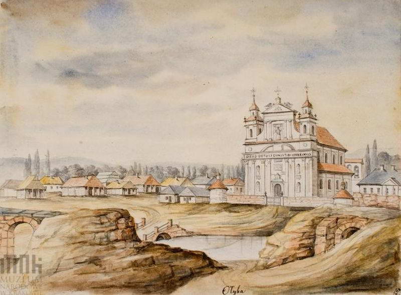 Kolegiata p.w. Św. Trójcy. Widok fasady i elewacji bocznej. Kościół trzynawowy, z dwiema niskimi wieżami, szczytem ze spływami i trójkątnym przyczółkiem w fasadzie; za kościołem arkadowa dzwonnica; cmentarz kościelny otoczony kamiennym murem z kaplicami w narożach; z prawej strony parterowy budynek z gankiem; z lewej drewniane, parteowe domy z podcieniami. Napis: Ołyka; napis na podkładzie: Wołyń. Ołyka, – kościół parafialny. 1874. Rys. ołówkiem podmalowany akwarelą. 20,5 x 27,8 cm. Muzem Narodowe, Kraków. III-r.a. 4218 (Teka Wołyń). [Katalog rysunków architektonicznych ze zbiorów Muzeum narodowego w Krakowie. 1. Rysunki Napoleona Ordy / Opracowały Zofia Kucielska i Zofia Tobiaszowa. – Warszawa: Państwowe wydawnictwo naukowe, 1975, Nr. 500]