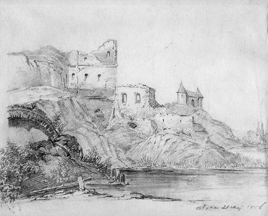 1856 р. Вигляд з боку річкиРозмір зображення: 912:735 піксел Рисунок 1856 р. з альбому «Дубенський форт-застава» |