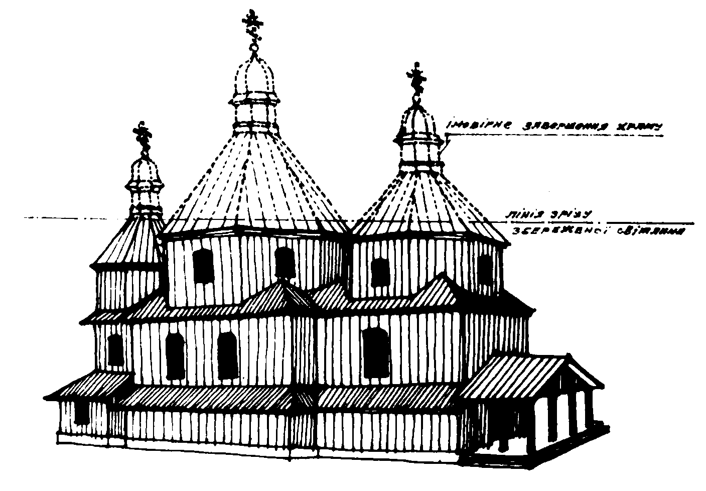 Опака. Церква Собору пp. Богородиці, 1890 р. Згоріла у 1942 р. Рисунок Ю. Дубика за світлиною з книжки «Дрогобиччина – земля Івана Франка», Дрогобич, «Бескид», 1993.
