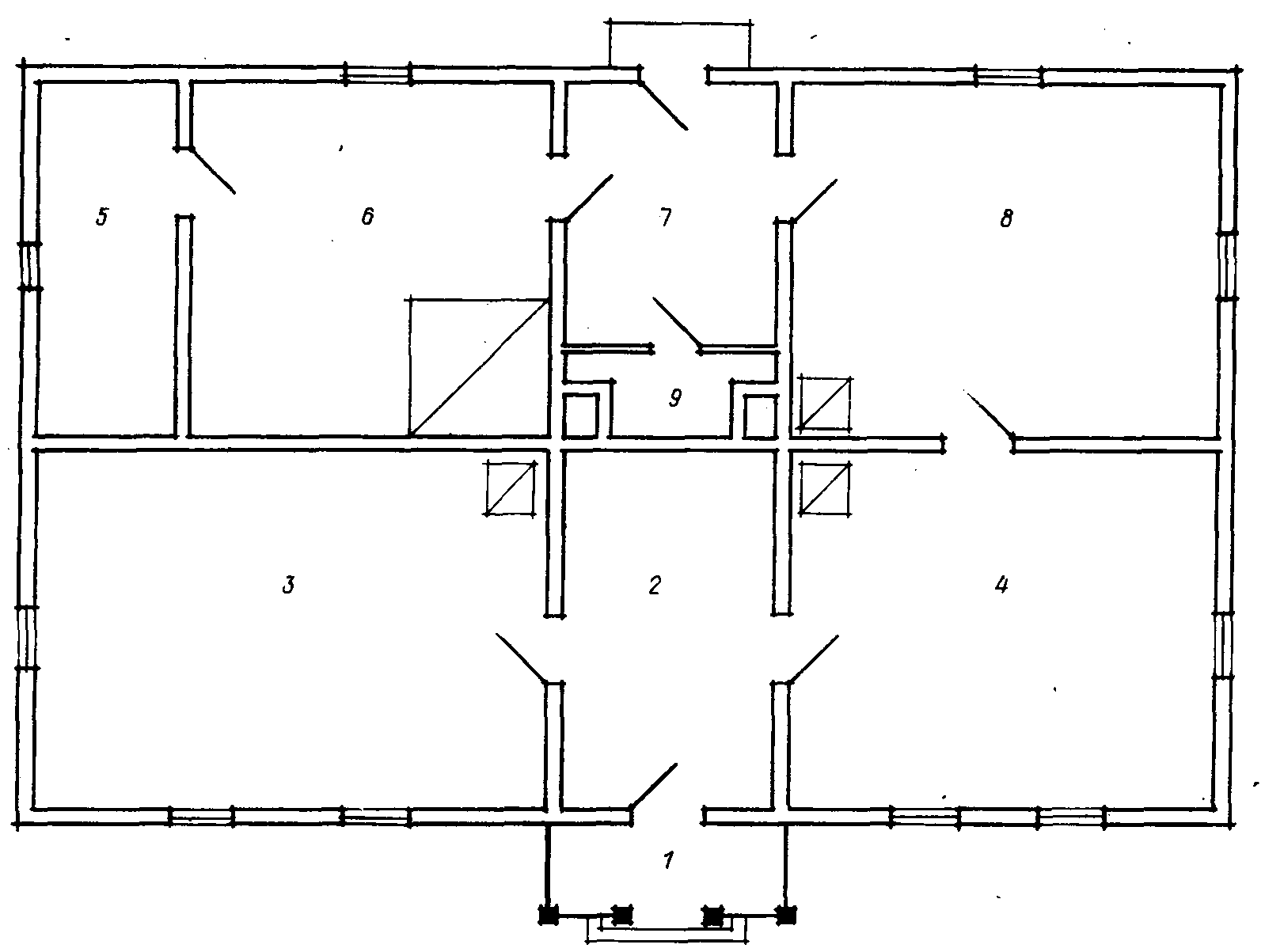 1 – ґанок, 2 – сіни парадні, 3 – канцелярія, 4 – світлиця, 5 – комірчина, 6 – кухня, 7 – сіни господарські, 8 – спальня, 9 – вудильня.