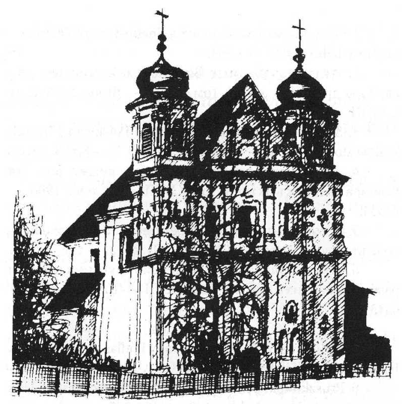 Костел, церква у 1887-1916 рр. Рисунок за: Rakowski G. Polska egzotyczna. – Pruszków, 1996. Джерело: Слободян В. Церкви Холмської єпархії. – Львів: Наукове товариство ім. Шевченка, 2005 р., с. 315.
