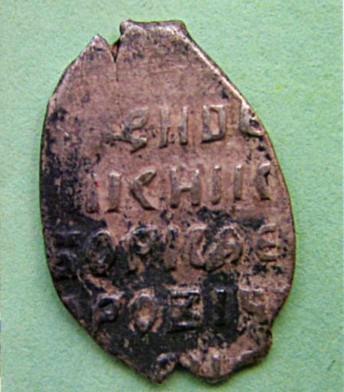 Копійка Бориса Годунова (1598 – 1605 рр.). Срібло. Цареборисівська фортеця. Новгородський монетний двір, 1598 – 1599 рр. Реверс. Розкопки І.В.Голубєвої 2004 р.