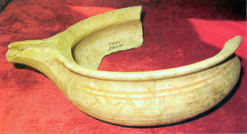Неповний профіль білоглиняної сковородки-латки (ринка) з червоним ангобовим орнаментом. Кераміка. Цареборисівська фортеця. Друга половина XVII ст. Розкопки І.В.Голубєвої 2004 р.