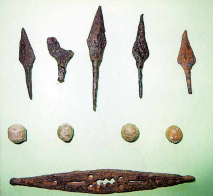 Предмети зброї: вістря черешкових стріл, кулі, перехрестя шпаги. Залізо, свинець. Цареборисівська фортеця. Кінець XVI – XVII ст. Розкопки І.В.Голубєвої 2004 р.