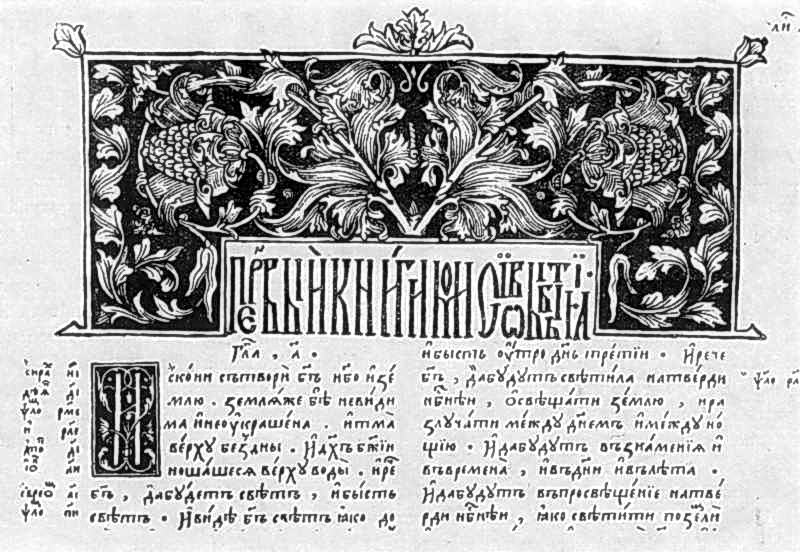ЗаставкаРозмір зображення: 800:552 піксел Заставка з першої сторінки Острозької біблії. 1581 р. (Острог). Джерело: Історія українського мистецтва. – К.: Наукова думка, 1967 р., т. 2, с. 343. |