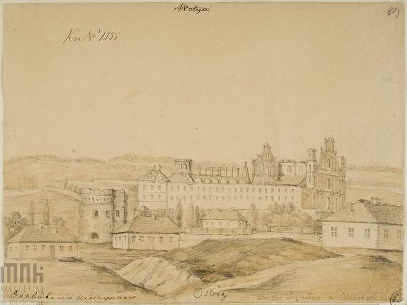 Ruiny kościoła i klasztoru pojezuickiego. Budynek klasztorny dwukondygnacjowy; kościół trzynawowy z dwuwieżową fasadą; z lewej strony baszta z krenelażem. 1862 – 1876. Dat.: 9 Września. Napis: Ostróg. Klasztor Jezuitów w Ostrogu; napis na podkładzie: G. Wolyńska Ostróg, — ruiny klasztoru i kościoła Jezuitów; napis na kartce doklejonej do podkładu: Ostróg. Ruiny Kościoła i Klasztoru Jezuitów — założonego przez Annę Aloizę Chodkiewiczową z domu Xa Ostrogska tu złożyła zwłoki męża Jana Chodkiewicza sprowadzone z Chocima w 1624. Rys. ołówkiem podmalowany sepią, 18,3x24,5. III-r.a. 4220 (Teka Wołyń). Bibl.: Album widoków, seria I, ii. 25. [Katalog rysunków architektonicznych ze zbiorów Muzeum narodowego w Krakowie. 1. Rysunki Napoleona Ordy / Opracowały Zofia Kucielska i Zofia Tobiaszowa. – Warszawa: Państwowe wydawnictwo naukowe, 1975, Nr. 508]