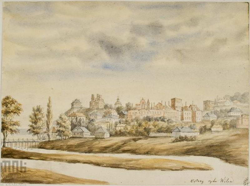 Widok ogólny od strony rzeki Willi z ruinami zamku i cerkwi p.w. Objawienia Pańskiego oraz klasztorem jezuitów. 1862 – 1876. Napis: Ostróg rzeka Wilia; napis na podkładzie: Wolyń. Ostróg, — ruiny zamku i klasztoru Jezuitów. Rys. ołówkiem podmalowany akwarelą, 20,5 x 27,8. Ill-r.a. 4219 (Teka Wołyń). [Katalog rysunków architektonicznych ze zbiorów Muzeum narodowego w Krakowie. 1. Rysunki Napoleona Ordy / Opracowały Zofia Kucielska i Zofia Tobiaszowa. – Warszawa: Państwowe wydawnictwo naukowe, 1975, Nr. 505]