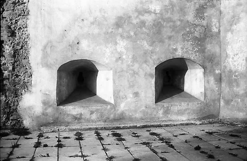 1985 р. Бійниці в нижньому ярусі північного фасаду. Вигляд з півночіРозмір зображення: 800:522 піксел 1985 р. 17 серпня. Фото М.І.Жарких. Негатека, № 294-09. |