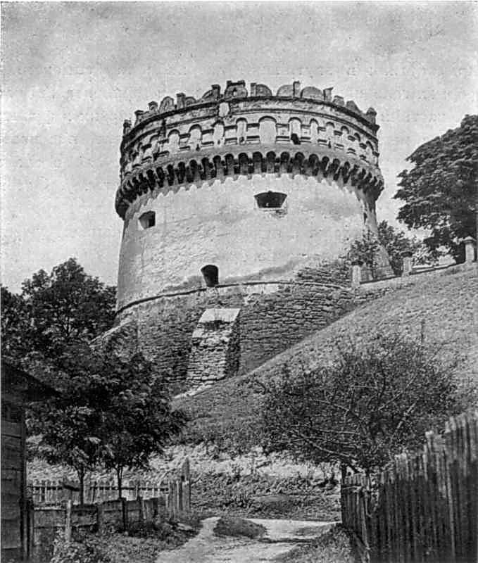 [1967 р.] Загальний вигляд з південного сходуРозмір зображення: 679:800 піксел Кругла башта замка в Острозі. XVI ст. Джерело: Історія українського мистецтва. – К.: Наукова думка, 1967 р., т. 2, с. 75. |
