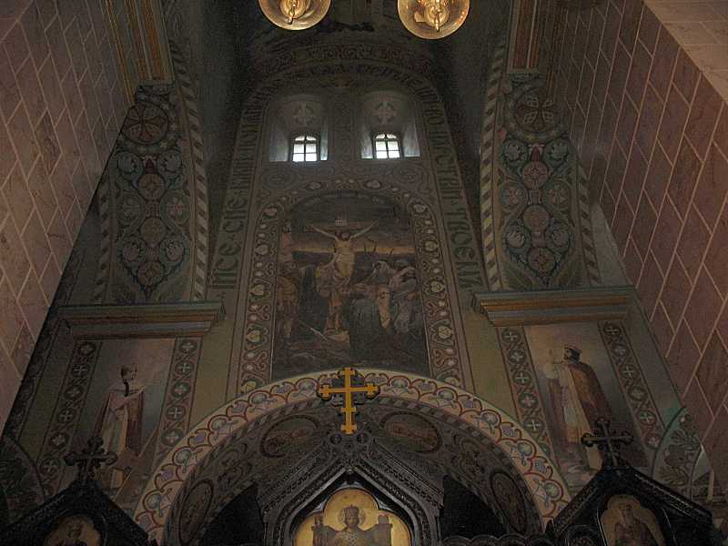 Східна стіна над іконостасомРозмір зображення: 800:600 піксел В центрі – «Розп’яття», нижчу ліворуч – св. княгиня Ольга, праворуч – св. князь Володимир. Фото Зенона Боровця і Богдана Тхора, 27 липня 2010 р. |