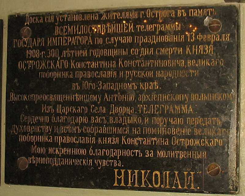 На дошці напис: «Доска сія устанволена жителями г. Острога в память всемилостивейшей телеграммы государя императора по случаю празднования 13 февраля 1908 г. 300-летней годовщины со дня смерти князя Острожского Константина Константиновича, поборника православия и русской народности в Юго-Западном крае. «Высокопреосвященнейшему Антонию, архиепископу Волынскому из Царского Села дворца. Телеграмма. Сердечно благодарю вас, владыко, и поручаю передать духовенству и всем собравшимся на поминовение великого поборника православия князя Константина Острожского мою искренню благодарность за молитвенные верноподданические чувства». Николай».