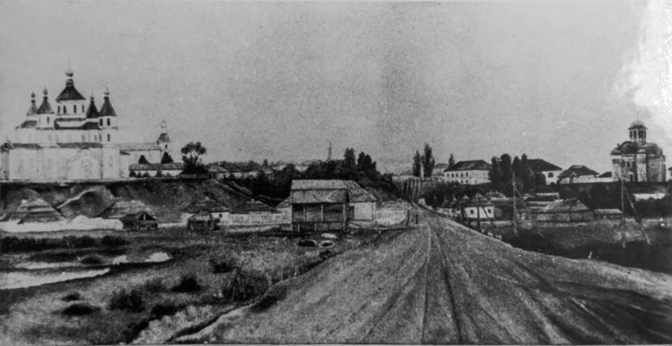 Вид з півдня, з коростенської дороги. Ліворуч – собор св. Спаса (колишній костел єзуїтів), за ним – костел домініканців, праворуч – церква св. Василя. Фото 1912 р.