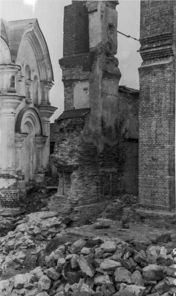 1907 р. Поруйнований котрфорсРозмір зображення: 582:979 піксел Вигляд з південного заходу. Фрагмент західного фасаду із контрфорсом. Фото П. П. Покришкіна 1907 р. |