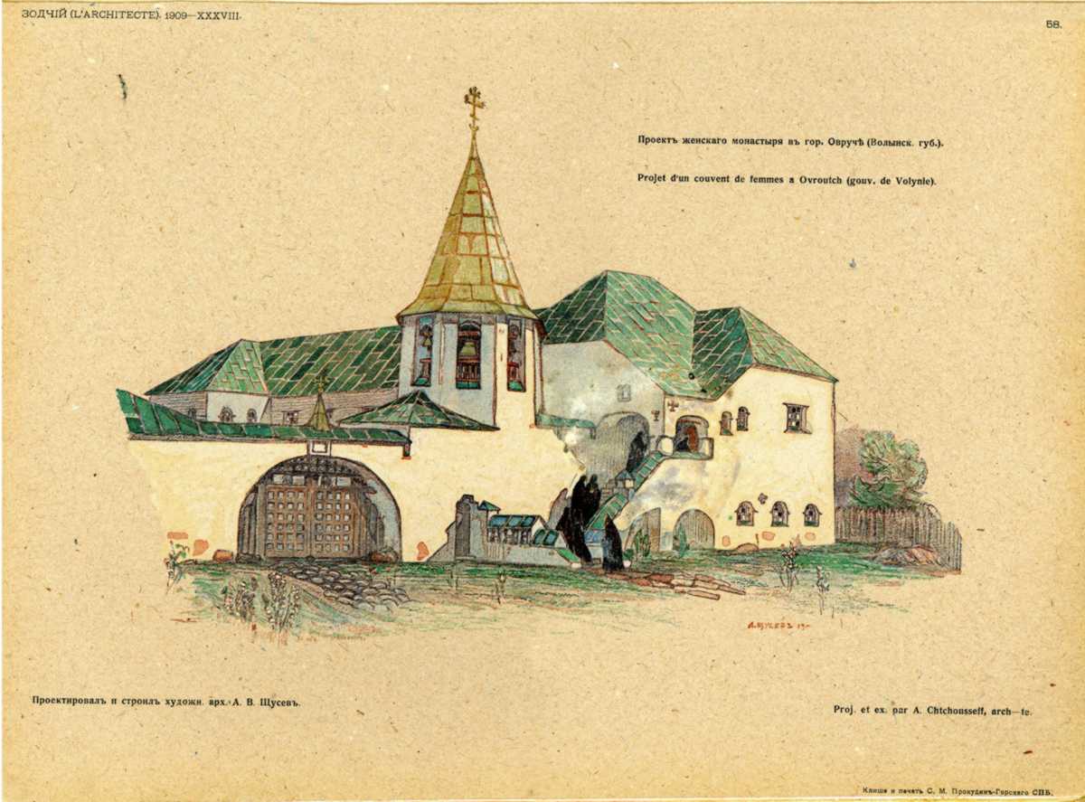 Щусев А. В. Женский монастырь в Овруче. Малюнок із журналу «Зодчий», 1909 рік . Це рисунок уже реалізованої будівлі.