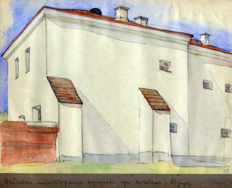 Монастирські корпуси при костелі (малюнок 32 см × 24 см, наклеєний на картон розміром 37 см × 28,5 см; у правому нижньому куті підпис – “Б. Р.”, а під малюнком, на картоні – “Остатки монастырских корпусов при костеле. Овруч. Б. Рерих. 1909”). Акварель Бориса Костянтиновича Реріха (1885 – 1945) з експедиції 1909 р. (нині зберігається в Інституті мистецтвознавства, фольклору та етнографії в Києві). Опубліковано 6 листопада 2019 р.
