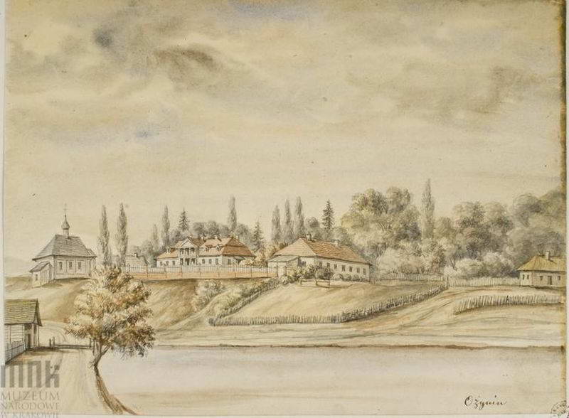 Dwór Jełowickich i kościół. Widok od strony wody. Dwór parterowy, kryty dachem łamanym, z portykiem kolumnowym i balkonem w dwukondygnacjowym ryzalicie środkowym; z prawej strony parterowa oficyna; z lewej jednonawowy kościół z sygnaturką. 1862—1876. Napis: Oźynin; napis na podkładzie: Wołyń. Ożynin, – dwór – Oźenin k. Ostroga. Rys. ołówkiem podmalowany akwarelą, 20,5x27,8. III-r.a. 4224 (Teka Wołyń). [Katalog rysunków architektonicznych ze zbiorów Muzeum narodowego w Krakowie. 1. Rysunki Napoleona Ordy / Opracowały Zofia Kucielska i Zofia Tobiaszowa. – Warszawa: Państwowe wydawnictwo naukowe, 1975, Nr. 514]