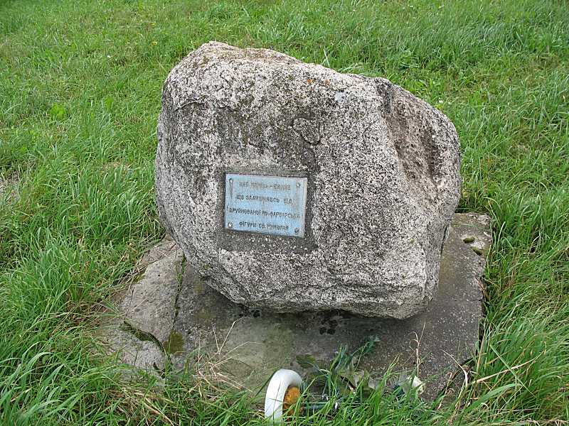 Камінь від старої фігуриРозмір зображення: 800:600 піксел Фото Зенона Боровця, 7 вересня 2006 р. Напис: «Цей камінь – єдине, що залишилось від зруйнованої по-варварськи фігури св. Миколая». |