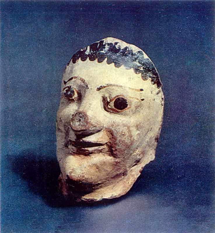 Фрагмент чоловічої голови (верхня частина фігурної посудини) з Ольвії. Родос (?). VI ст. до н.е. Глина. Висота 5,2 см. Київський історичний музей.