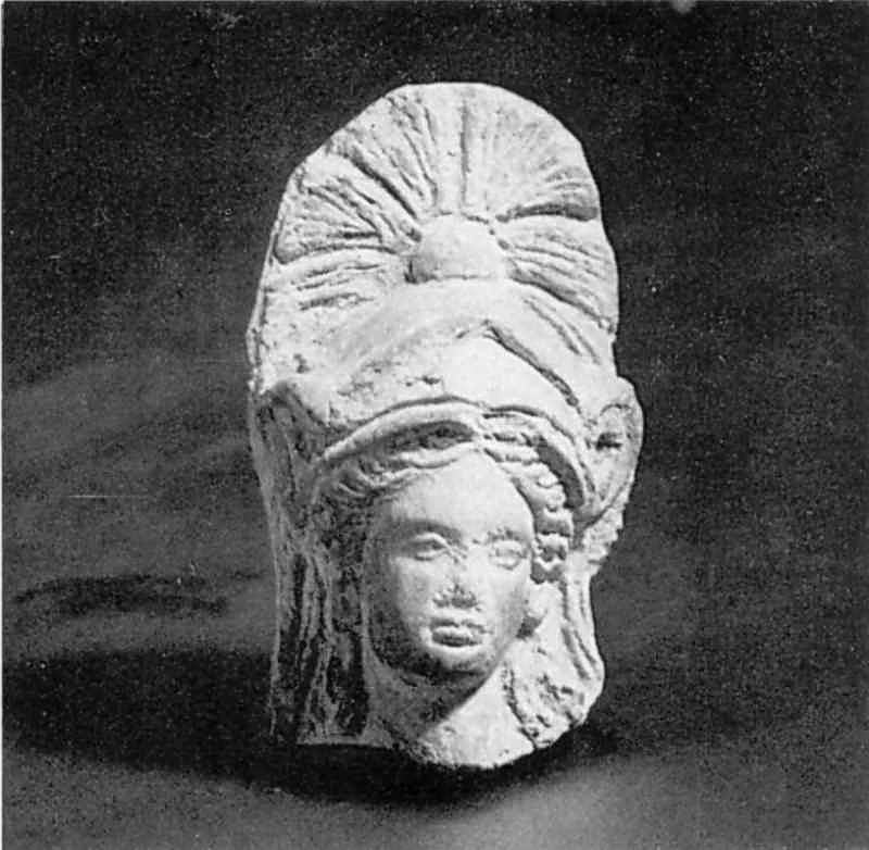 Загальний виглядРозмір зображення: 800:782 піксел Голова Афіни в шоломі з Ольвії. IV ст. до н.е. Теракота. Висота 5,3 см. Київський історичний музей. Джерело: Античне мистецтво. – К.: Мистецтво, 1977 р., № 41. |