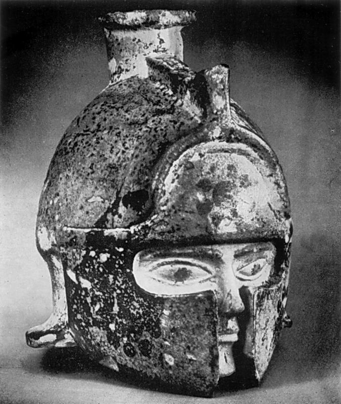 Сосуд предназначался для хранения душистых масел. Выполнен в виде головы воина в коринфском шлеме. Подобные сосуды в Северном Причерноморье известны только в двух экземплярах.
