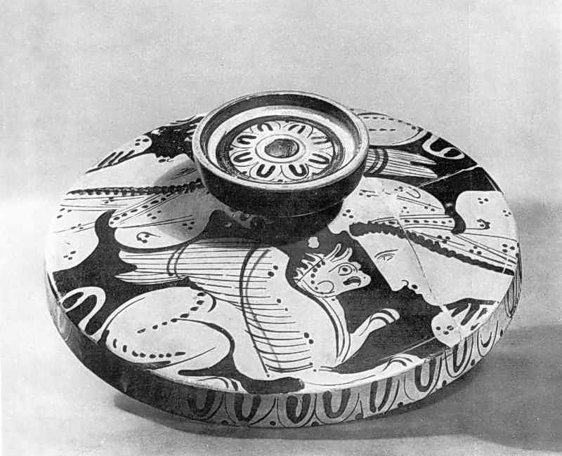Накривка лекани червонофігурної з зображенням амазонок. IV ст. до н. е. Глина. Діаметр 18 см. Київський історичний музей.