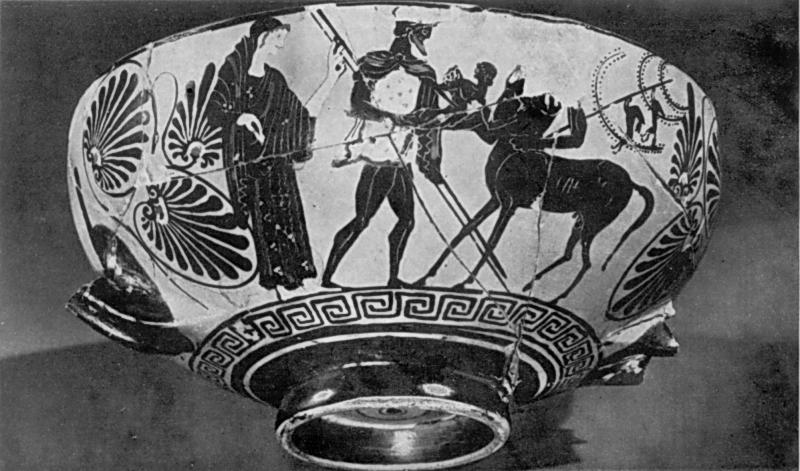 По обеим сторонам чаши между ажурными пальметами помещены мифологические сцены: Пелей передает своего сына Ахилла в обучение мудрому кентавру Хирону – воспитателю многих выдающихся греческих героев; Аполлон, играющий на лире среди муз. Чаша приписывается мастеру Pholos.