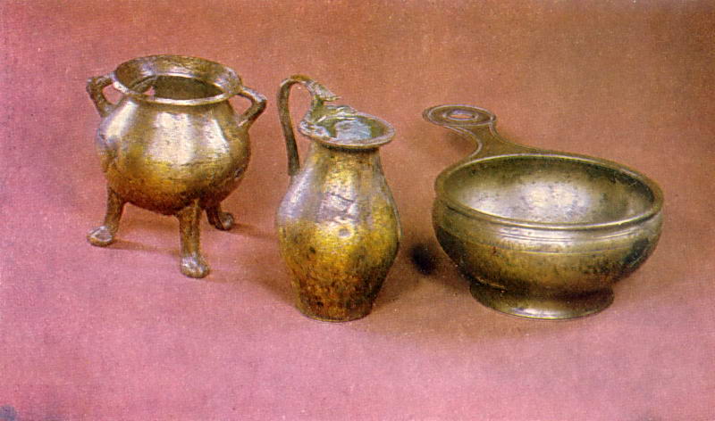 Римский импорт. Чаша на трех ножках, возможно, служившая курильницей, кувшин с фигурной ручкой италийского производства и ковш с латинским клеймом на кольце ручки производства Южной Галлии.