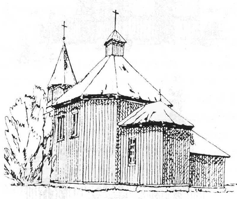 Загальний вигляд з позиції А2. Рисунок Оксани БойкоРозмір зображення: 800:674 піксел Джерело: Слободян В. Церкви Холмської єпархії. – Львів: Наукове товариство ім. Шевченка, 2005 р., с. 80. |