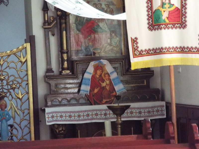 Греко-католицька церква Різдва БогородиціРозмір зображення: 800:600 піксел Греко-католицька церква Різдва Богородиці. Фрагмент інтер'єру. Фото Івана Парнікози, 16 вересня 2019 р. |