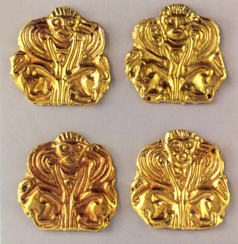 Курган Розмір зображення: 779:800 піксел Вкладені елементи Бляшки у формі сфінксів Бляшки у формі оленів Шолом