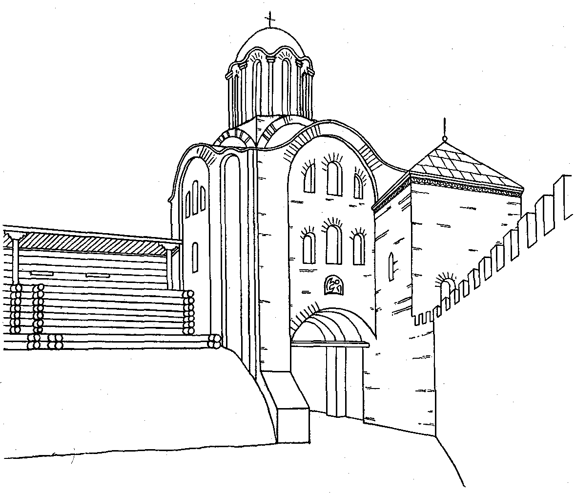 Єпископські ворота в Переяславі. 1089 р. Реконструкція Ю. С. Асеєва, мал. С.I.Кашая.