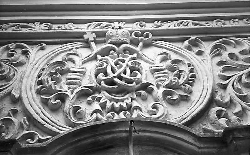 Рельєфний картуш з гербом над дверимаРозмір зображення: 800:495 піксел 1977 р. 3 червня. Фото М.І.Жарких. Негатека, № A287-17. |