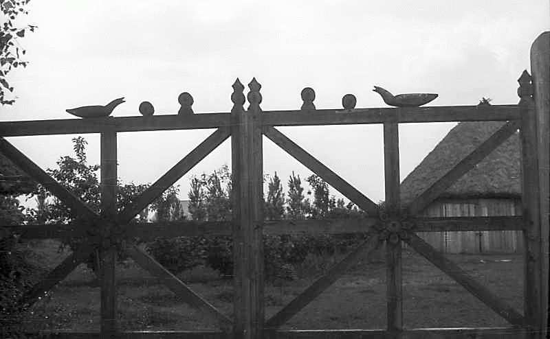 1976 р. Ворота Розмір зображення: 800:494 піксел 1976 р. 30 травня. Фото М.І.Жарких. Негатека, № A127-11. Вкладені елементи Різьблений стовп