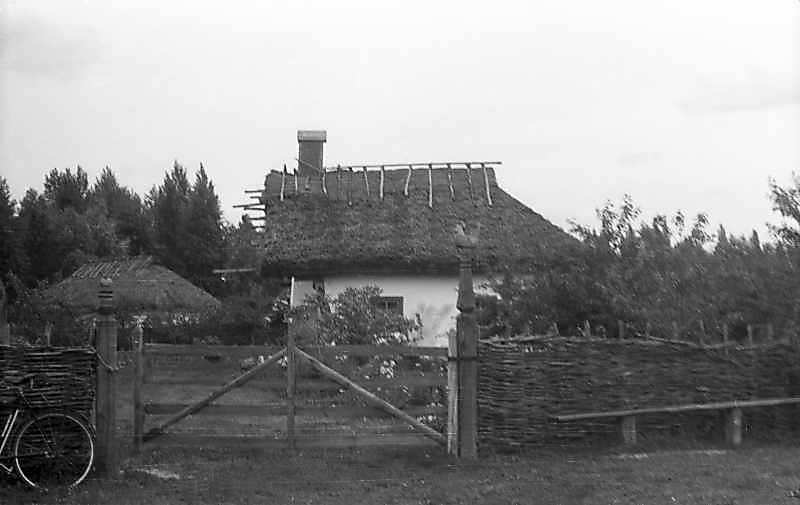 1977 р. Ворота і хата Розмір зображення: 800:505 піксел 1977 р. 3 червня. Фото М.І.Жарких. Негатека, № A284-10. Вкладені елементи 1977 р. Півник на стовпці воріт