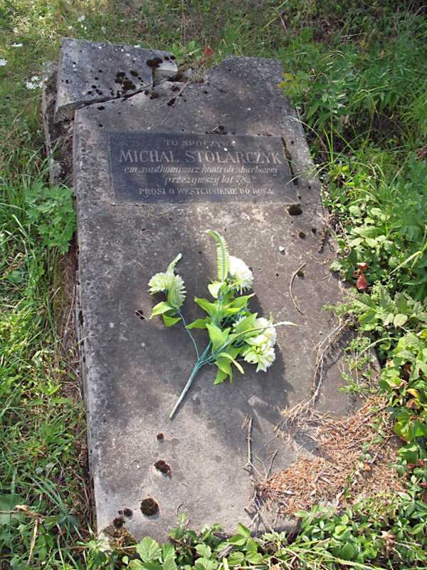 Напис (польською мовою): «Тут спочиває Міхал Столярчук, ем[еритований] підкомісар контролю скарбового, проэив років 78. Просить про зітхання до бога».
