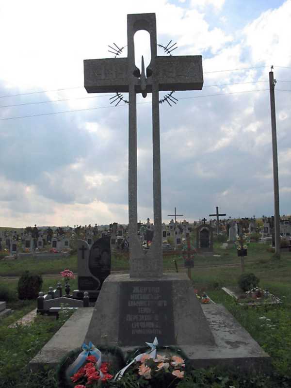 Пам’ятний хрест жертвам московського тероруРозмір зображення: 600:800 піксел Фото Зенона Боровця і Богдана Тхора, 9 серпня 2012 р. Напис: «Жертвам московсько-комуністичного терору. Перезахоронено 134 чоловіка. Вічна пам’ять». |