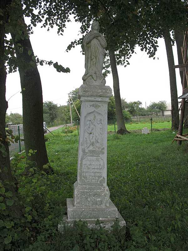 Скульптура «Непорочне зачаття»Розмір зображення: 600:800 піксел Фото Зенона Боровця і Богдана Тхора, 7 вересня 2006 р. Нижче – рельєф «Хрещення». Напис: «Сію ікону соорудив во славу божу Іван Витрикуш (?) с женою своєю теклею р. 1897». |